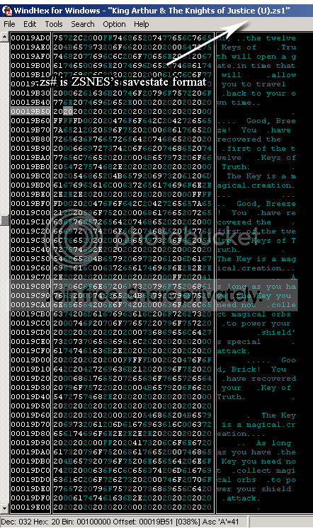 To begin with some text is compressed and some isn't. How do I know this? Because I've looked through both the ROM and multiple save states in a hex editor. In the ROM none of Merlin's hint text appears in plain text format but it does appear in a savestate made at the end of the game. Note: This text does NOT appear in a savestate made at the beginning of the game. Thus it seems logical that the game decompresses these hints as they are needed and loads them into temporary memory which is then never erased.